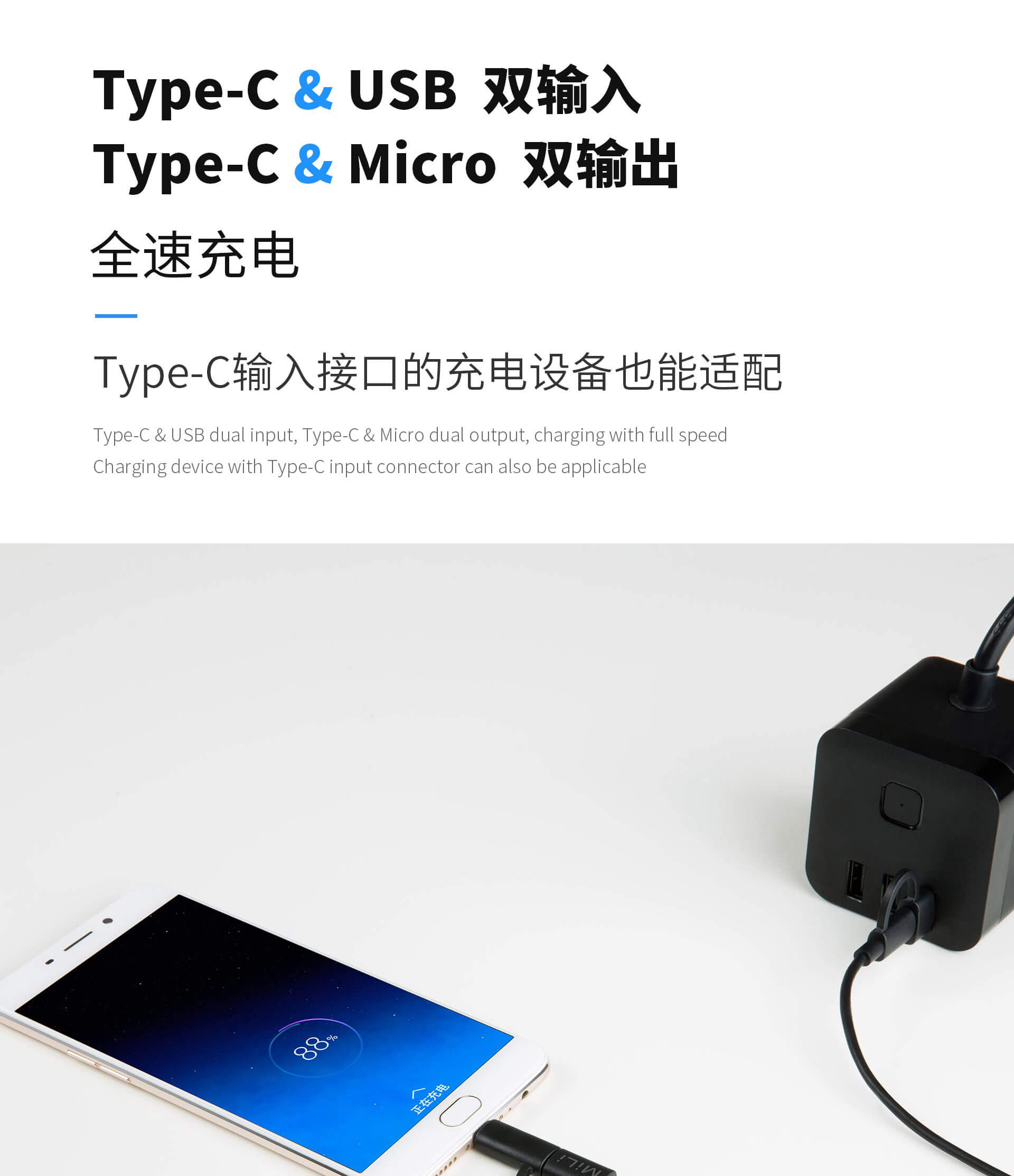 Type-C & USB雙輸入 Type-C & Micro雙輸出,3A 快充電流輸出